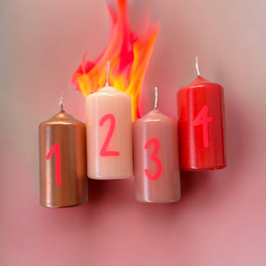 Lysene er produceret i Tyskland, og et sæt består af fire håndlavede adventslys, hver med et glansfuldt lag lak og et neonrosa tal, der lyser festligt op som konfetti i vintermørket! 🎀